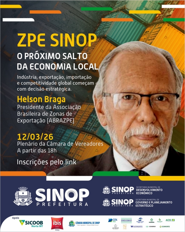 O evento contará com a presença e palestra do presidente da Associação Brasileira de Zonas de Exportação (ABRAZPE), Helson Braga. Na ocasião, além da troca de ideias e experiências com empresários dos mais diversos setores, Helson irá discutir o tema “Potencial e impactos da ZPE na economia de Sinop”.