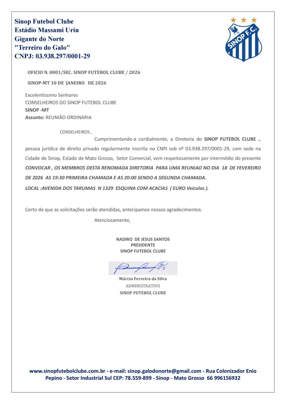 A Diretoria do Sinop Futebol Clube, convoca, os membros desta renomada diretoria, para uma reunião no dia 18 de Fevereiro (hoje), as 19:30 Primeira Chamada, e as 20:00 horas, sendo a Segunda Chamada.