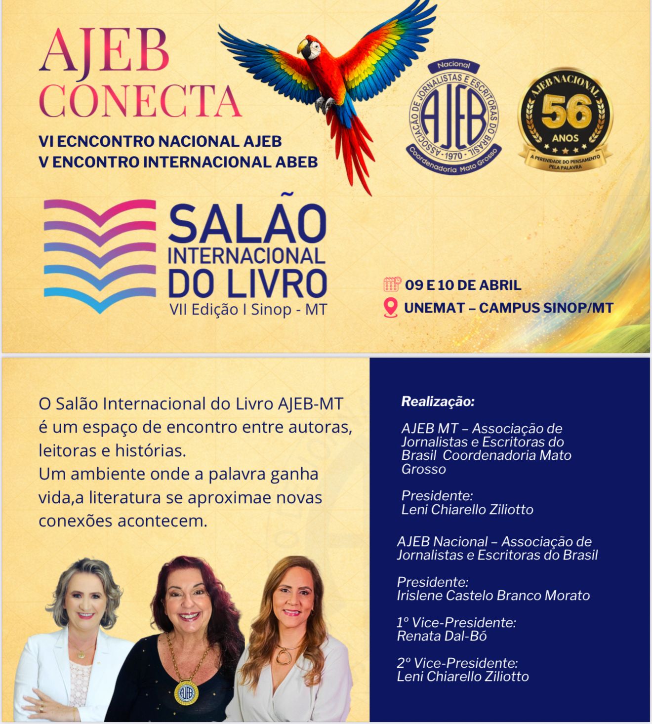 Esta semana a Associação de Jornalistas e Escritoras do Brasil (AJEB) promoverá, de 9 a 12 de abril de 2026, em Sinop (MT), o VI Encontro Nacional e o V Encontro Internacional da AJEB. O evento será sediado e coordenado pela AJEB-MT e reunirá escritoras, jornalistas, autoridades, artistas e representantes de quinze estados, das coordenadorias de várias regiões do país. A programação ocorrerá na UNEMAT, na Câmara Municipal de Vereadores de Sinop e em outros espaços da cidade.