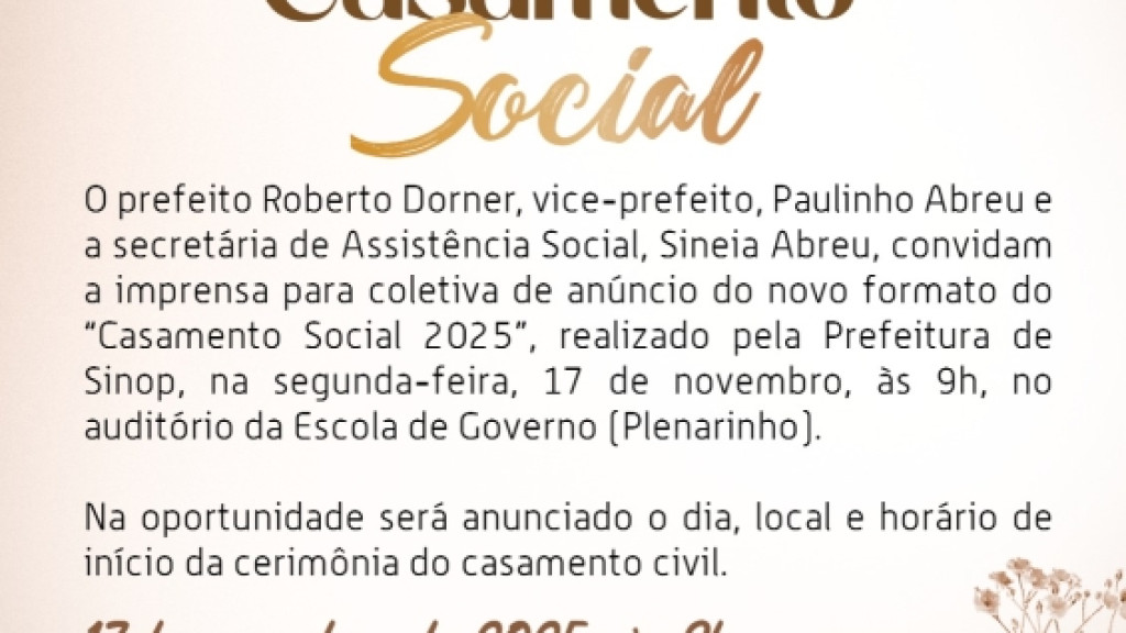 Prefeitura de Sinop lançará o Casamento Social 2025 em coletiva de imprensa, segunda-feira (17)