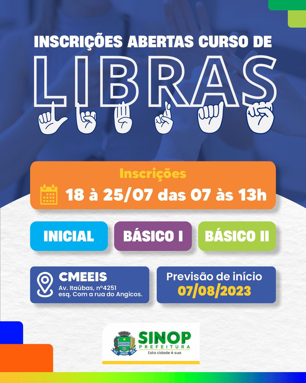 Estão abertas as inscrições para o curso de Língua Brasileira de Sinais (Libras), oferecido gratuitamente pela Prefeitura de Sinop, por meio do Centro Municipal de Educação Especial Inclusiva de Sinop – CMEEIS. O curso é ofertado pela Secretaria de Educação, em parceria com a Associação dos Surdos de Sinop, desde o ano de 2016. Somente no primeiro semestre participaram 110 alunos, em três turmas.