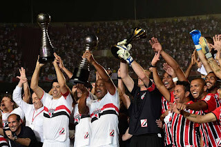 As taças dos três mundiais são erguidas por Raí, Ronaldão e Rogério