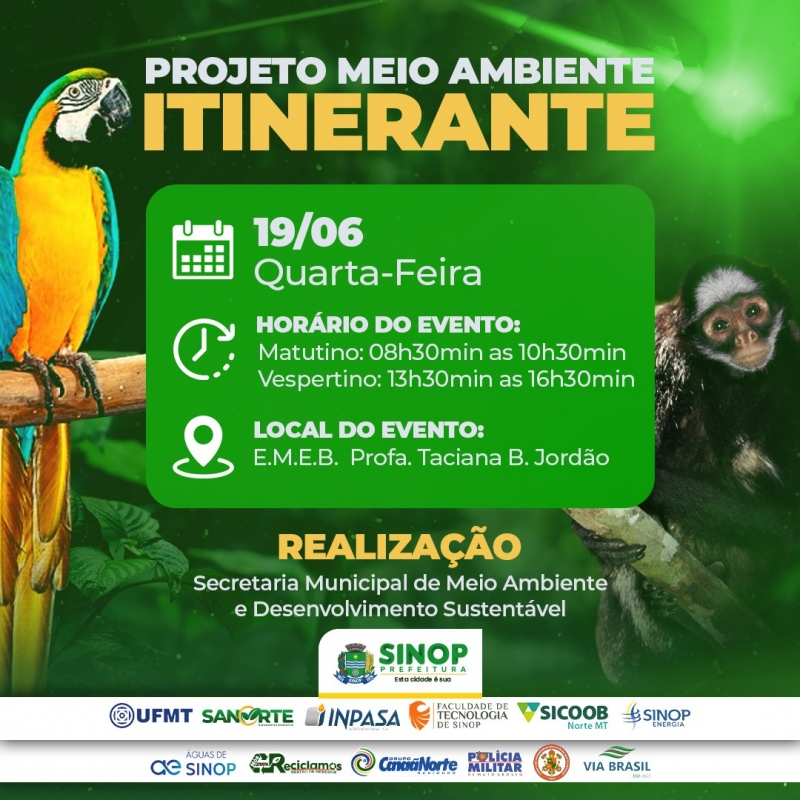 Nesta quarta-feira, dia 19, a Escola Municipal de Educação Básica Taciana Balth Jordão, localizada no Jardim Paraíso, recebe o Projeto Meio Ambiente Itinerante. O evento será desenvolvido pela equipe da Secretaria Municipal de Meio Ambiente e Desenvolvimento Sustentável, no período matutino das 8h30 a 10h30 e vespertino das 13h30 às 16h30.