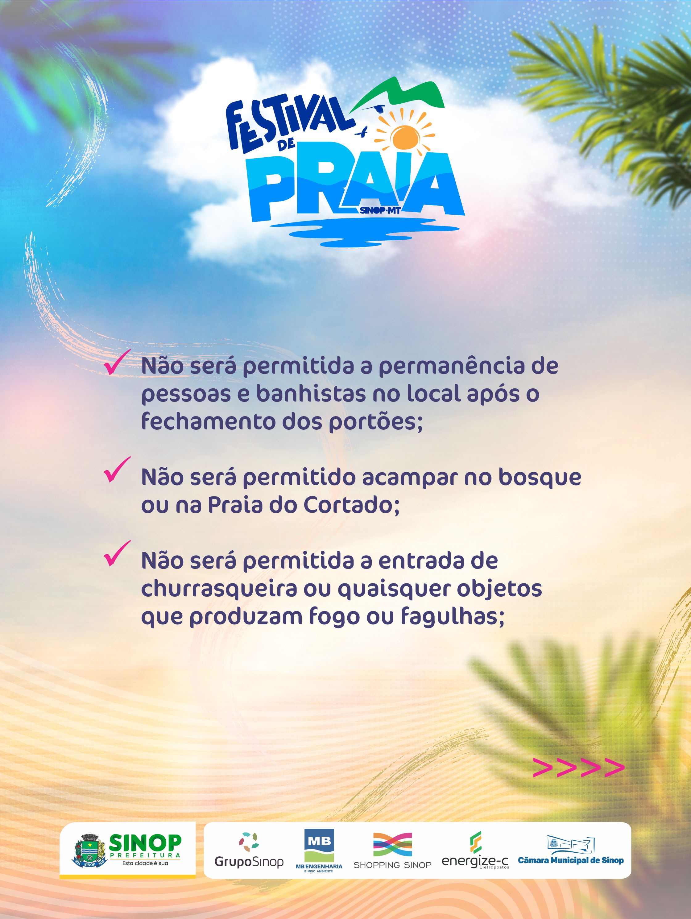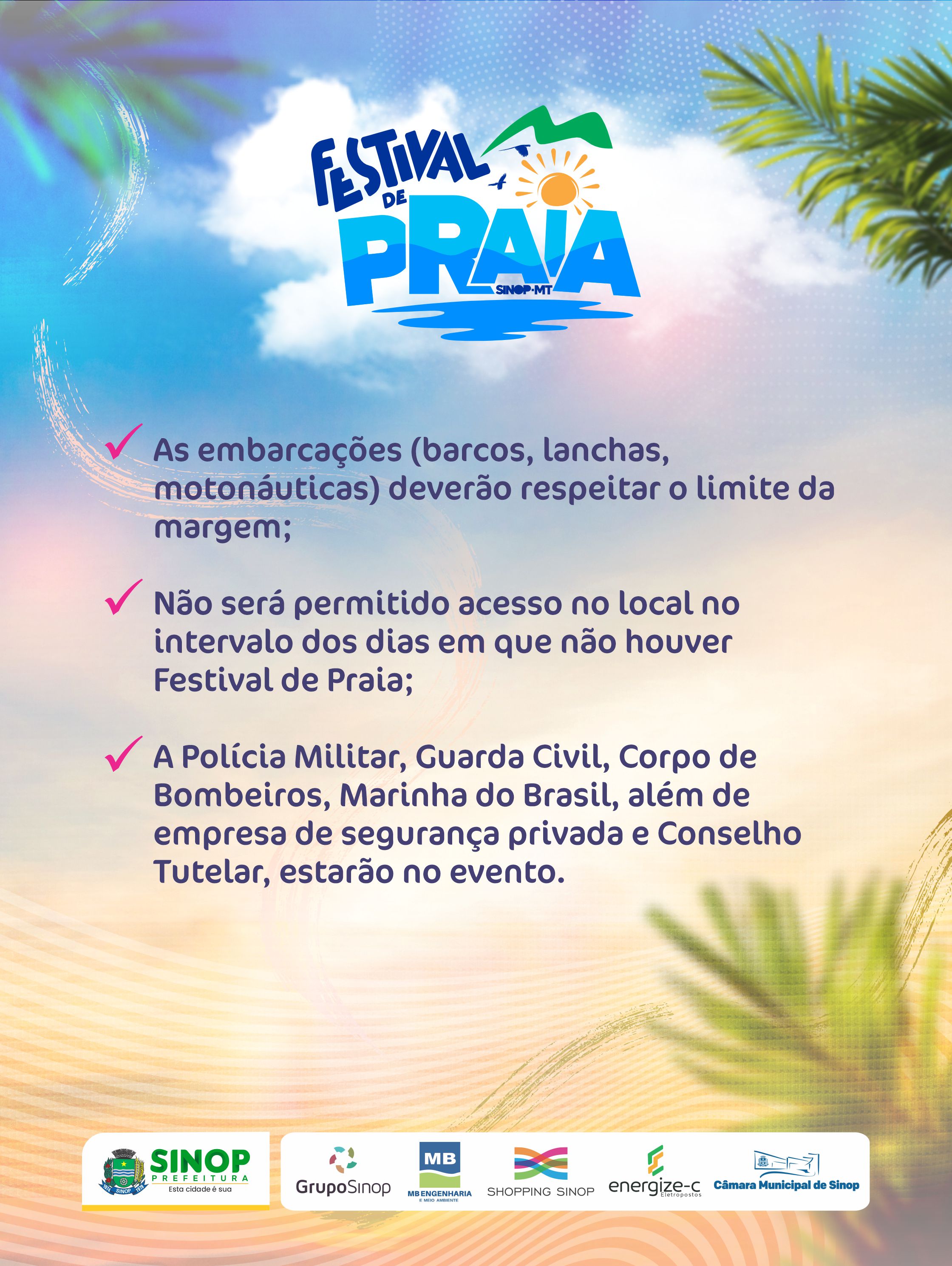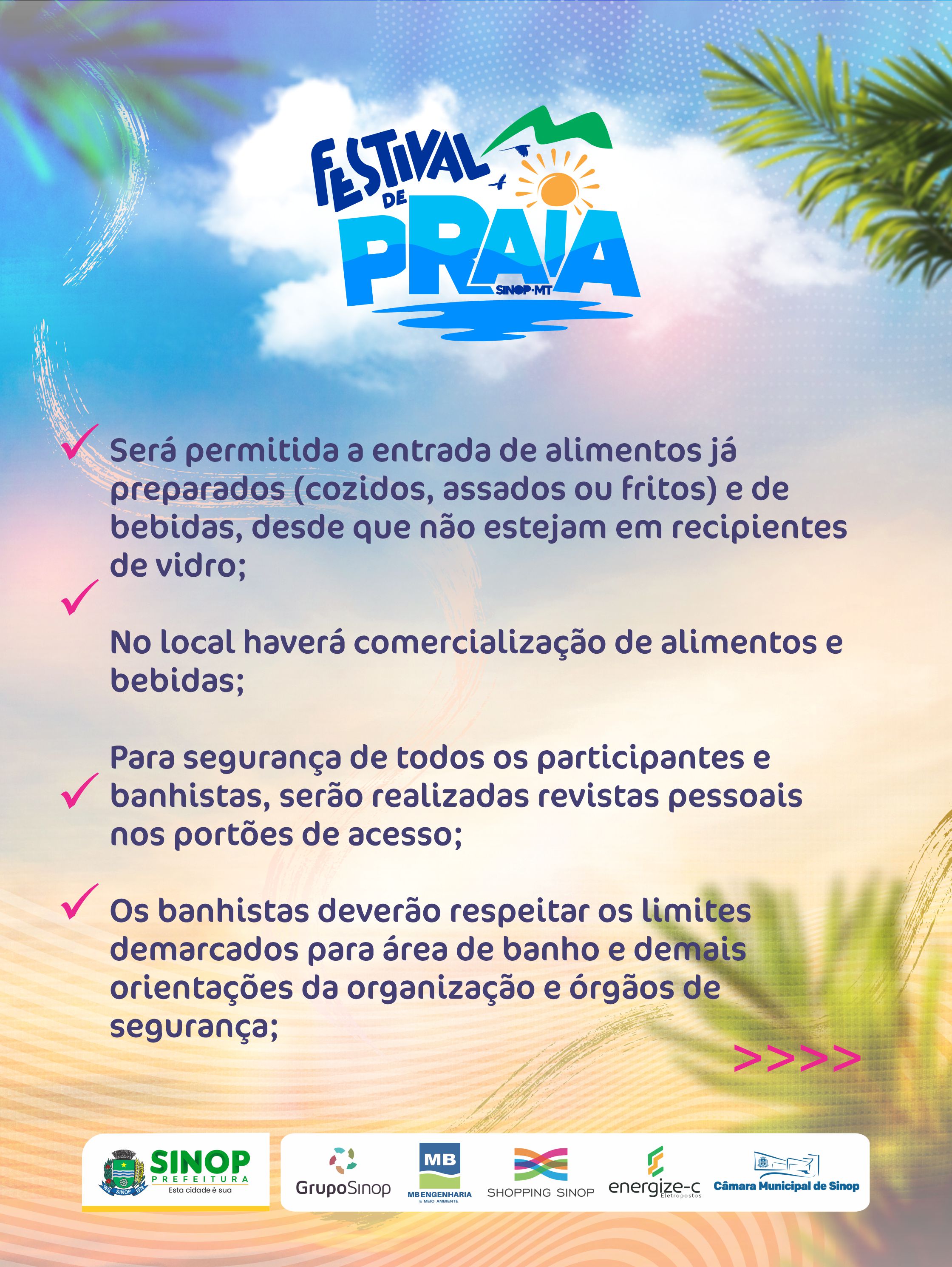 *Para segurança de todos os participantes e banhistas, bem como cumprimento de normas estabelecidas pelas Forças de Segurança do município, serão realizadas revistas pessoais nos portões de acesso;