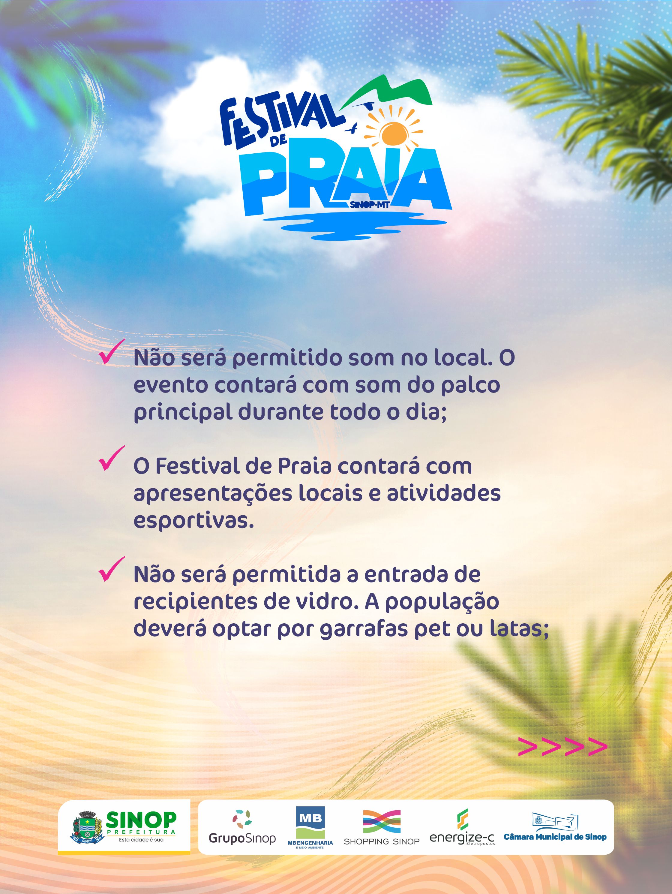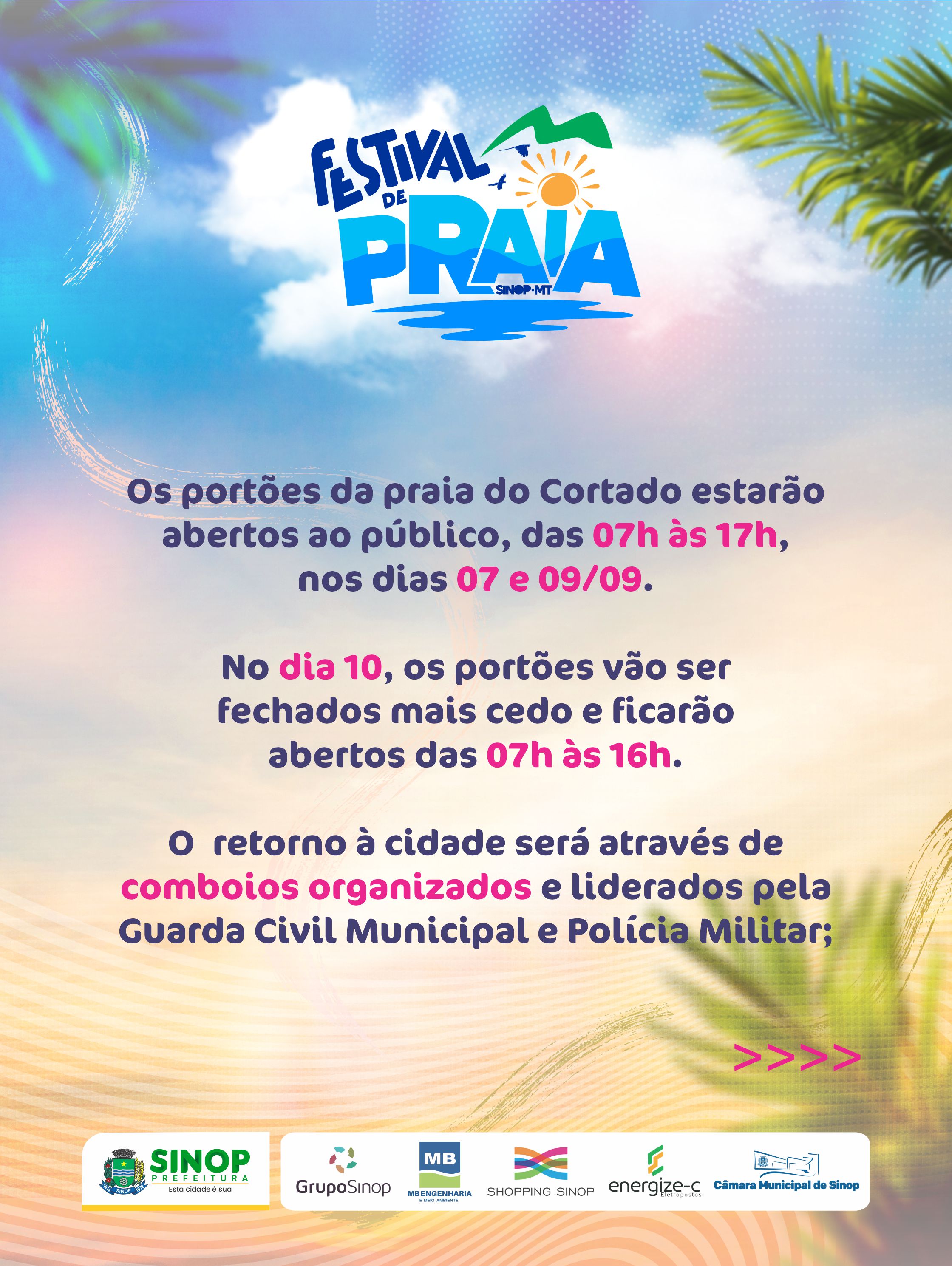 No ano em que Sinop completa 49 anos, a Prefeitura preparou o FESTEJA SINOP, com uma série de atividades voltadas para o bem-estar e entretenimento do cidadão. Dos grandes eventos, entre shows nacionais e desfile cívico, destacamos o Festival de Praia, evento que ocorrerá na praia do cortado, no rio Teles Pires. O Festival começa na quinta-feira, 7 de setembro, e segue pelos dias 9 e 10. Os três dias de festividade serão marcados pela acessibilidade, segurança e atração cultural a nível nacional com Joelma, no dia 10 de setembro.
