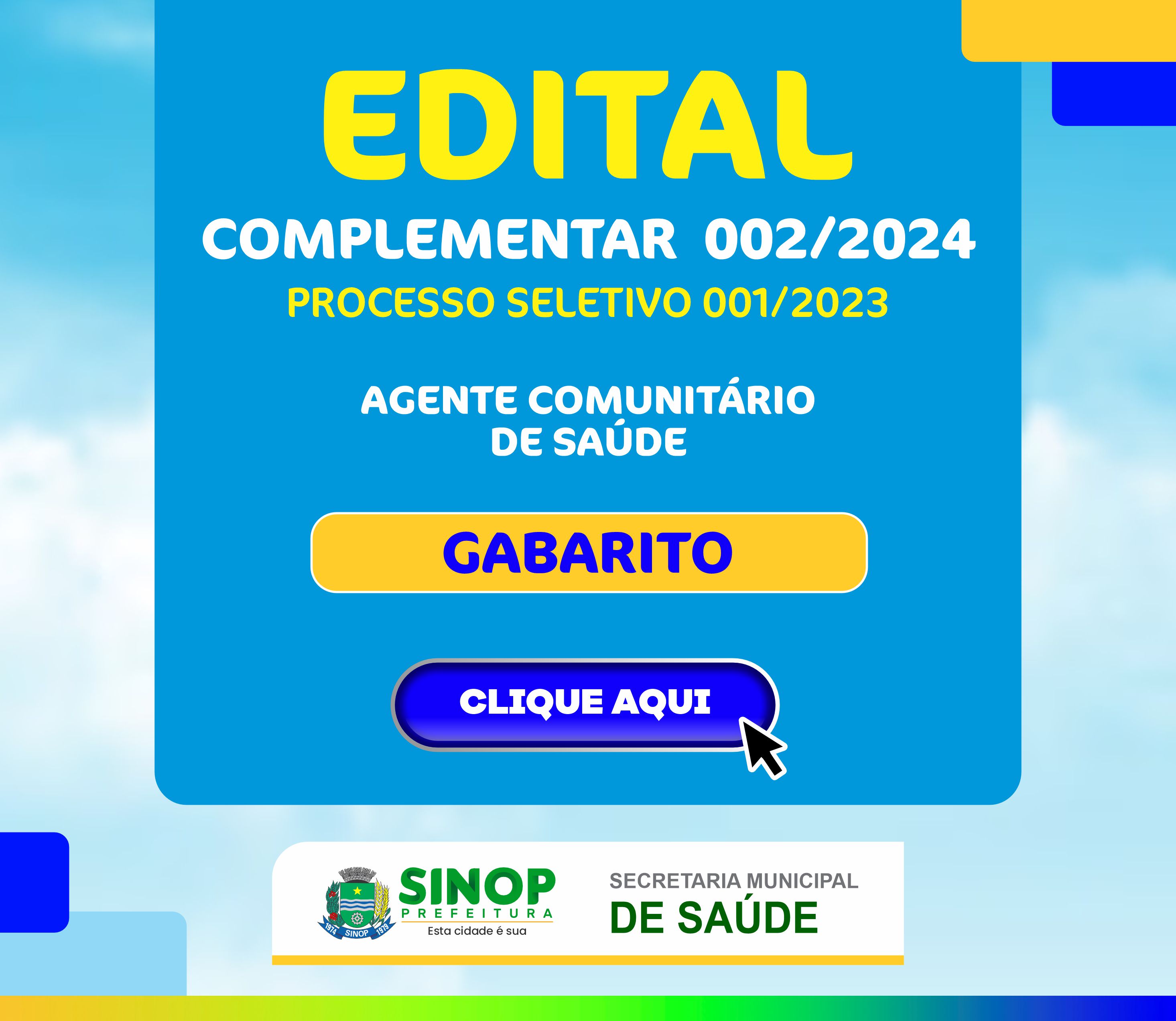 Na quarta-feira (17) será a publicação oficial do gabarito. Já o prazo para recursos da prova e gabarito vai do dia 18 a 22 de fevereiro, e no dia 26 a publicação final do gabarito após recursos. A publicação da relação dos candidatos aprovados e classificados será no dia 07 de fevereiro. Os candidatos podem conferir o gabarito da prova através do endereço eletrônico: https://www.sinop.mt.gov.br/fotos_downloads/513.pdf .