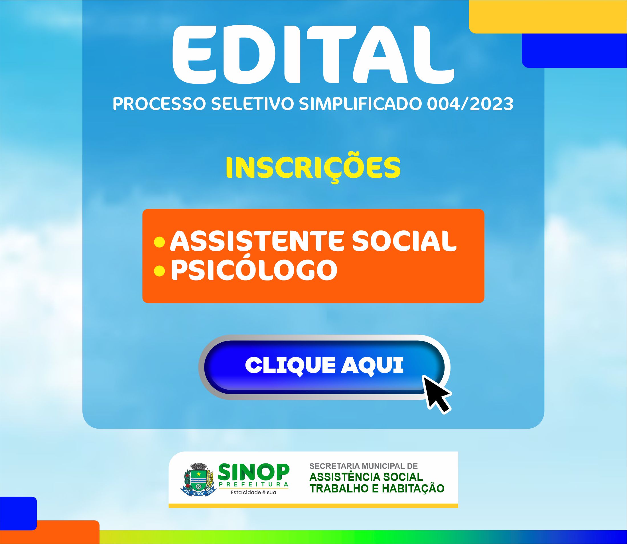 Começou nesta segunda-feira (18) e segue até 12 de janeiro de 2024, o período de inscrições para o Processo Seletivo Simplificado Nº 004/2023, da secretaria de Assistência Social, Trabalho e Habitação, destinado à contratação de 14 Assistentes Sociais e 7 vagas de Psicólogos. As inscrições devem ser feitas no site oficial da Prefeitura Municipal, pelo link: https://www.gp.srv.br/rh_sinop/servlet/wprecadastrocandidato?0