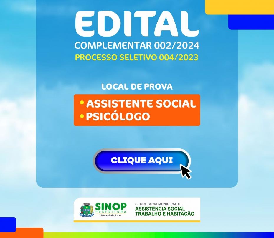 Candidatos ao Processo Seletivo Simplificado (Nº 004/2023), para contratação de psicólogos e assistentes sociais que irão atuar na secretaria de Assistência Social, Trabalho e Habitação, passarão por prova neste domingo (4). A avaliação será na Escola Estadual Nilza de Oliveira Pipino, das 8h às 11h. Confira o edital https://www.sinop.mt.gov.br/fotos_downloads/522.pdf