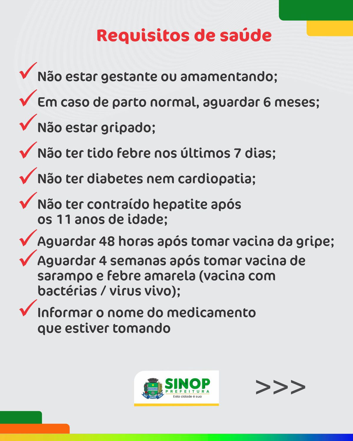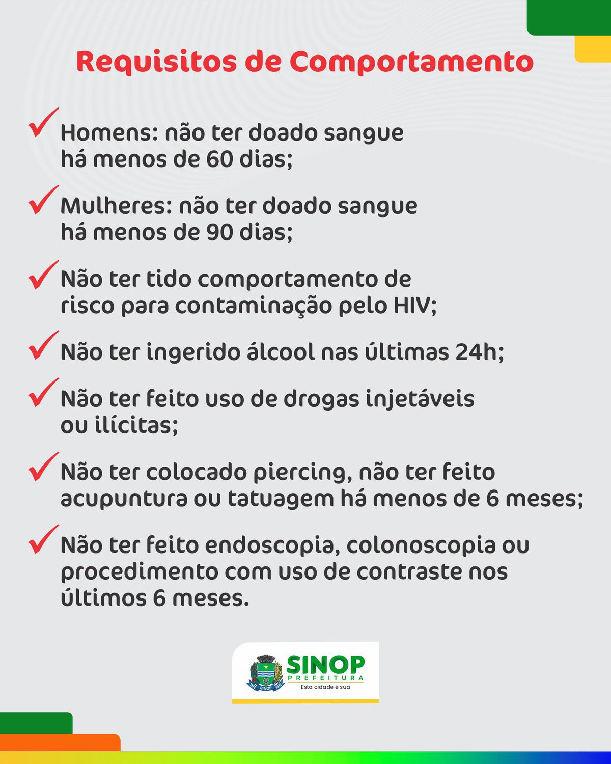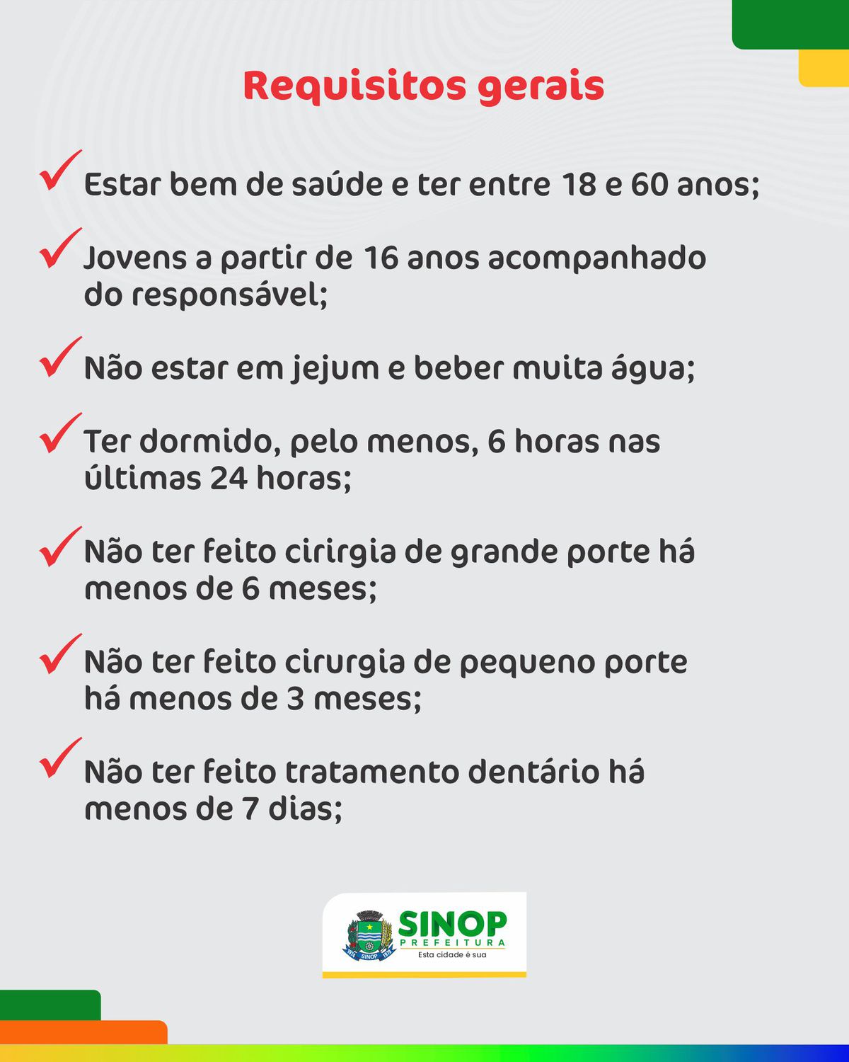 Para ser elegível como doador, é necessário estar em boas condições de saúde, ter entre 16 a 69 anos (menores de 18 anos devem estar acompanhados pelos responsáveis), pesar mais de 50 quilos, estar alimentado e não ter ingerido bebidas alcoólicas nas últimas 24 horas.
