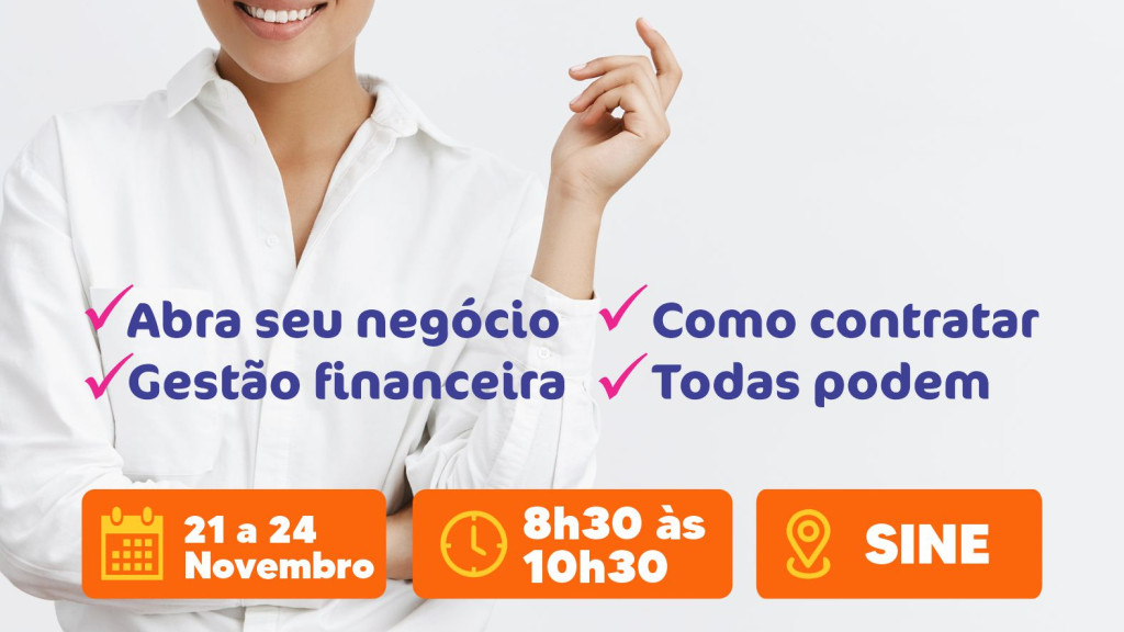 Em comemoração ao dia Internacional do Empreendedorismo Feminino, celebrado dia 19 de novembro, a pasta do Trabalho, da secretaria de Assistência Social, em parceria com a secretaria de Desenvolvimento Econômico e SEBRAE, realiza um ciclo de palestras nos dias 21, 22, 23 e 24 de novembro, para mulheres que empreendem ou desejam ingressar neste ramo. As inscrições são gratuitas e podem ser feitas no site oficial da Prefeitura de Sinop.