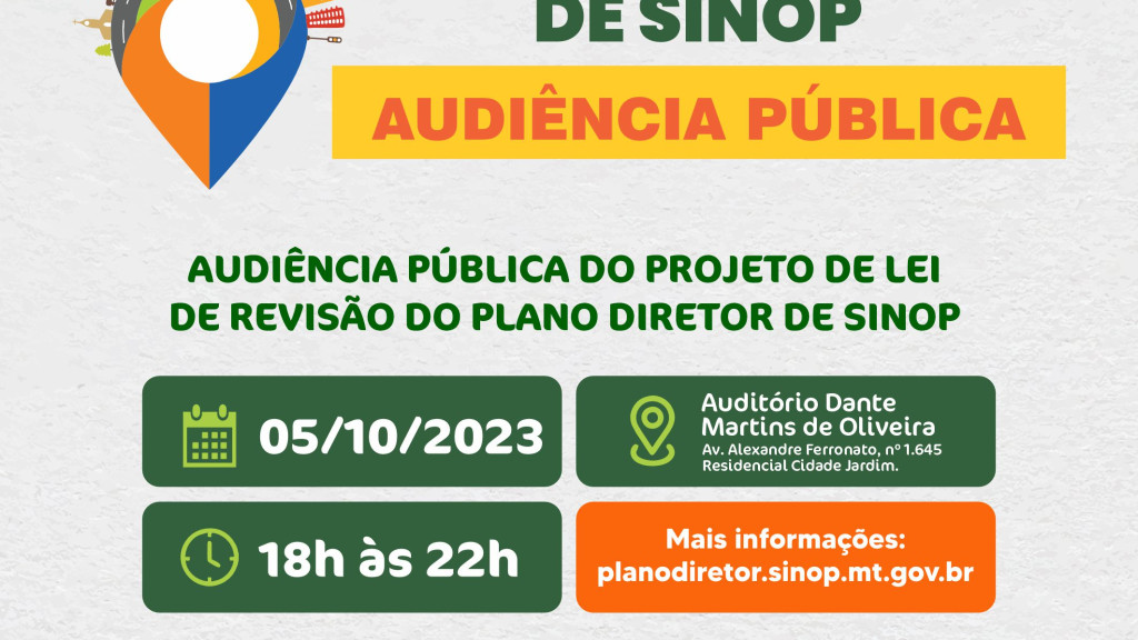 Está chegando o dia da Audiência Pública para apresentação e discussão da proposta de projeto de lei de revisão do Plano Diretor de Sinop. Neste evento a população poderá conhecer, debater e contribuir com o projeto. A Audiência será no dia 5 de outubro de 2023, das 18h às 22h, no auditório do Centro de Eventos Dante de Oliveira (Av. Alexandre Ferronato, nº 1.645 - Res. Cidade Jardim).